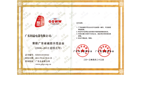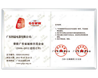 4月,獲 “廣東省誠信示范企業(2006-2012連續七年)”稱號;